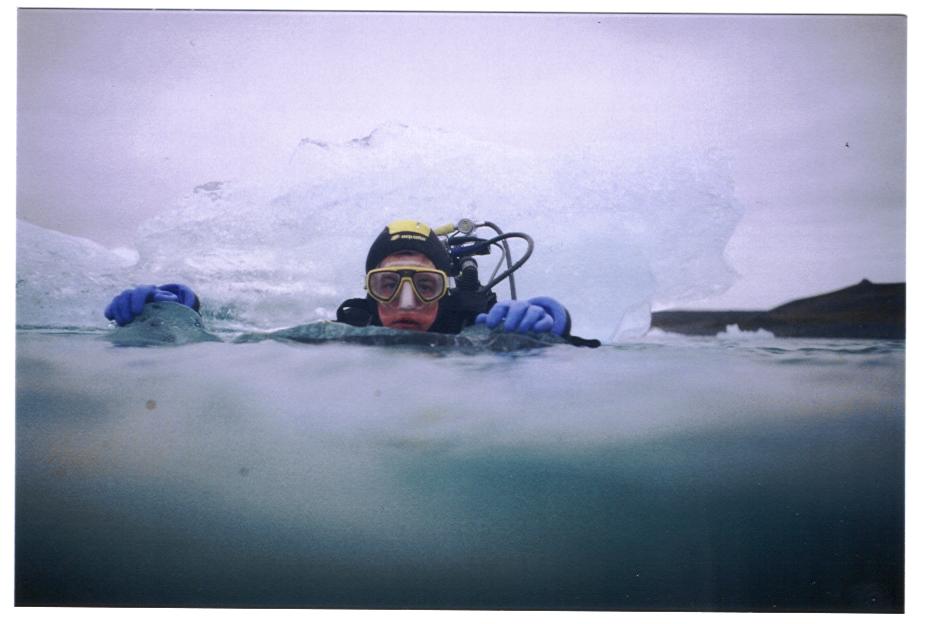 Die Entscheidung war gefallen, wir fahren zurück in Richtung Reykjavik und dann die Südküste entlang. Dort sollte das Wetter jetzt besser sein. Doch nur um Reykjavik selbst klarte der Himmel etwas auf. Die Fahrt die Südküste entlang hatten wir nur strömenden Regen mit Blick auf die imposanten Ausläufer der Berge und Gletscher, die wir auf unserem Weg passierten. Ziel war der Eissee Jökulsarlon, ein See voller Eisberge und Eisbrocken eines Gletschers aus dem Vatnajökull-Massiv, direkt an der Straße. Auch dort wollten wir mal reinschauen, obwohl die zuständige Touristinformation bzw. Verwaltung große Bedenken hatte. Doch unsere langjährige Erfahrung mit dem Tauchen an Eisbergen in Grönland hat sie schliesslich umgestimmt, und wir konnten uns in die Nähe von kleineren Eisbergen in unseren Trockis wagen. Da es sich um Schmelzwasser aus dem Gletscher handelt, ist der See natürlich äusserst trüb, richtig abtauchen ist zwecklos und außerdem höchst gefährlich. Doch was für ein Erlebnis, endlich wieder mal Eisberge zwischen die Trockentauchhandschuhe zu bekommen.