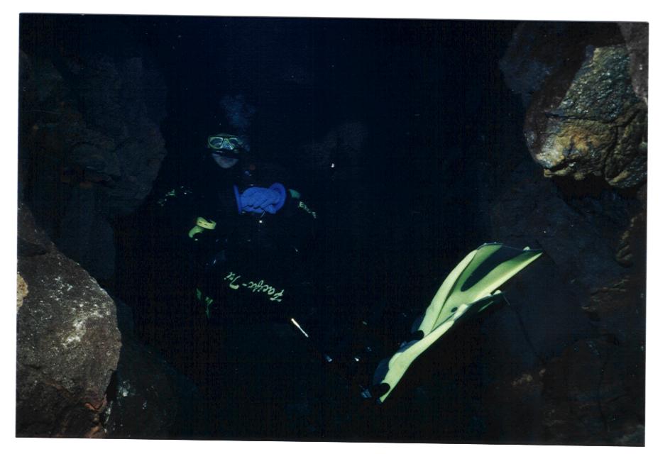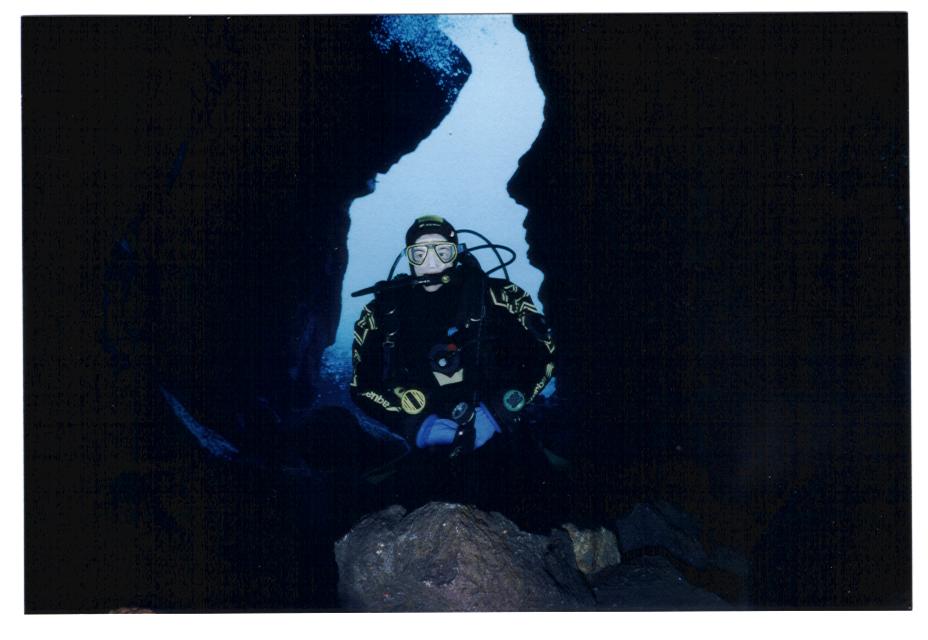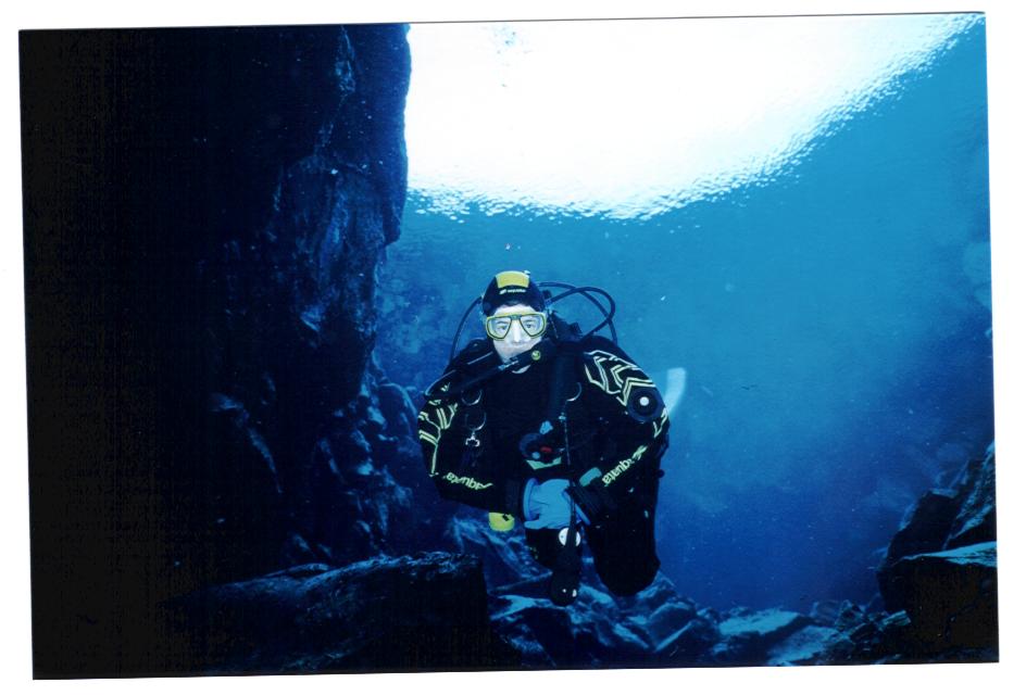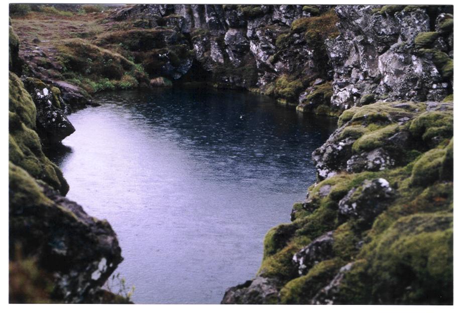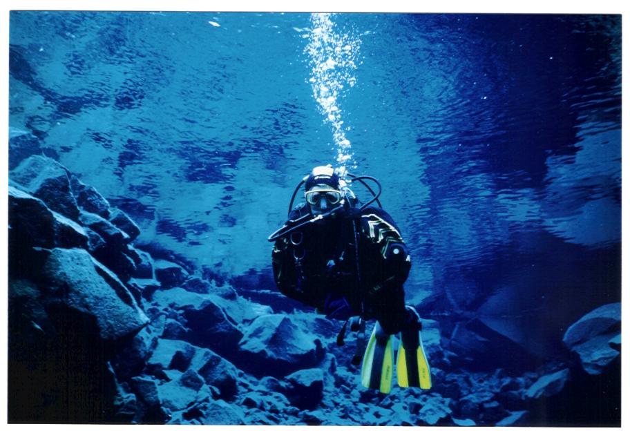Doch kaum abgetaucht, befindet man sich in einem etwa 15 m tiefen Becken mit kristallklarem Wasser und Blick auf die berühmte Spalte zwischen den beiden Kontinentalplatten, der europäischen und der amerikanischen. Ganz nah, auf ca. 2m Spannweite, ist man hier zwischen den Kontinenten, tiefer hinab geht es in die Dunkelheit, doch immer bleibt einem der Blick zum Einstieg, der aussieht, als ob man den blauen Himmel sehen könnte - doch leider hat es bei unserer Anwesenheit geregnet.