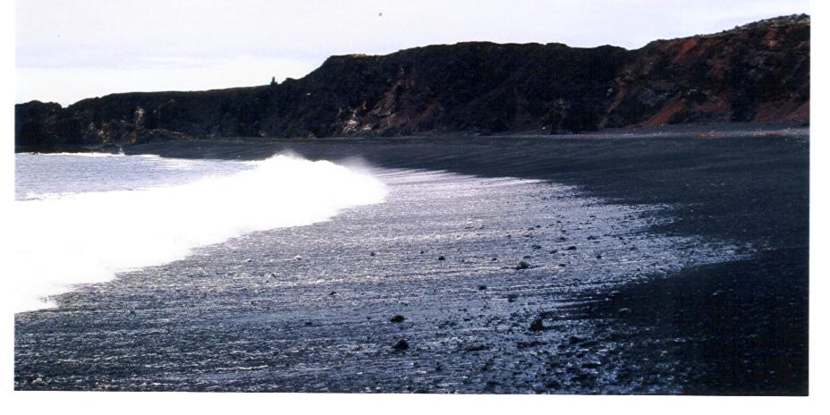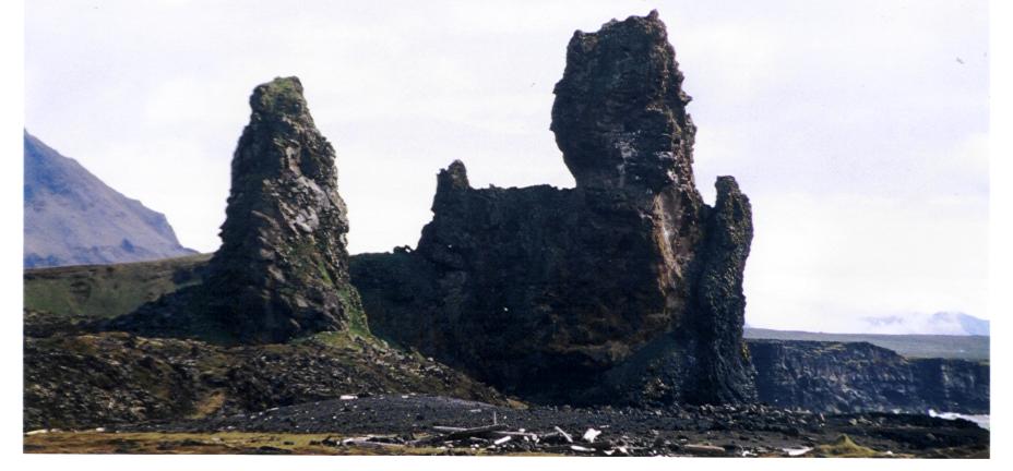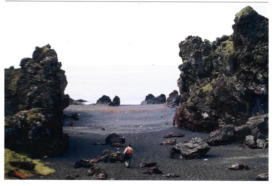 Es hat fast immer geregnet, oder gestürmt, oder beides. Doch die schönen Tage konnte man umso besser geniessen. Und einer davon fand statt, als wir eine Landzunge an der Westküste in Richtung des Gletschers Snaefellsjökull kennenlernen wollten. Hier an dieser bizarren Küste mit Lavafeldern, die ins Meer gestürzt sind, den saftigen grünen Wiesen und dem Blick auf die Schnee- und Eiskappe des Gletschers, fanden wir dann den schwarzen Strand, dessen Eingang zwei Basaltsäulen bildeten. Hier wollten wir tauchen - nach einem längeren Fußmarsch zum Strand stand uns aber ein Hindernis entgegen - die starke tosende Brandung, über die wir nicht hinweg kamen. Also mussten wir unverrichteter Dinge - und total am Rande unserer Kräfte - abbrechen und den Weg zurück antreten. Wie sich jeder Taucher vorstellen kann, natürlich in Trockentauch-Ausrüstung mit entsprechend Blei für Salzwasser - also eine reife sportliche Leistung.